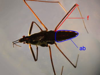 Hind femur (f) long, reaching beyond tip of abdomen (ab); No lateral scent grooves present