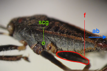 Hind femur (f) short, barely reaching tip of abdomen (rarely surpassing) (ab); Metasternum with pair of lateral scent grooves (scg)