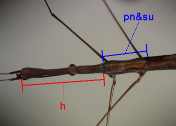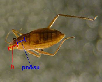 Body long, slender; Head (h) equal to or longer than length of pronotum and scutellum (pn&su) combine