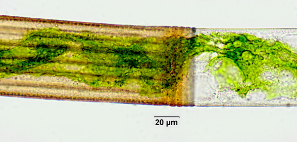 Older hemi-cell wall is stained with iron oxide (rust), from pond on campus of University of New Hampshire, Durham NH USA. Image by John Dufresne